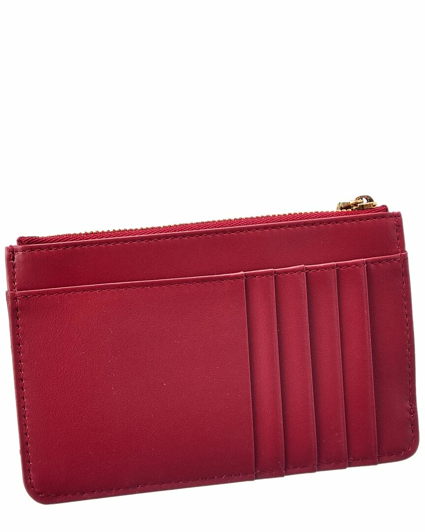 - Devotion Leather Card Holder in red quilted leather with gold-tone hardware and card slots