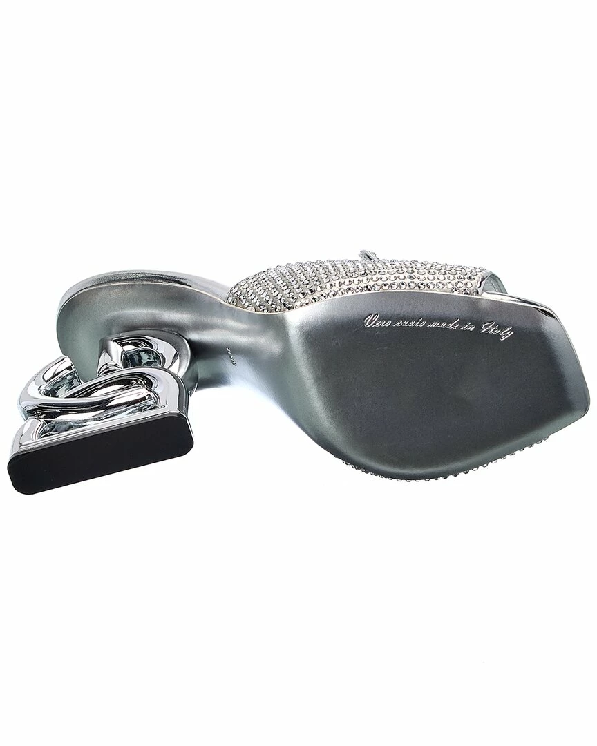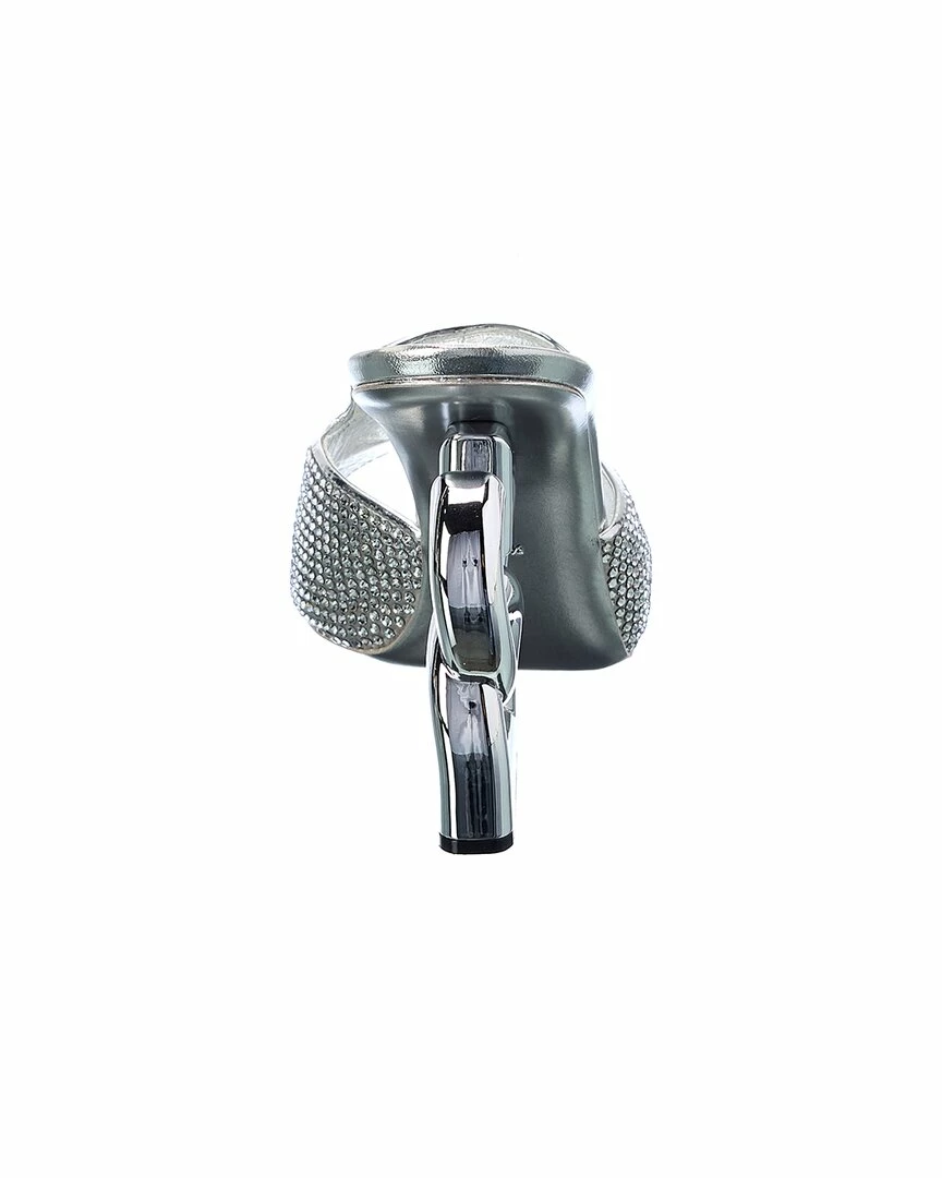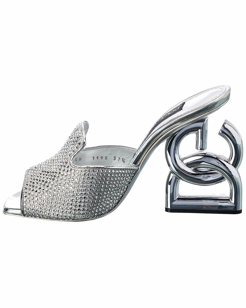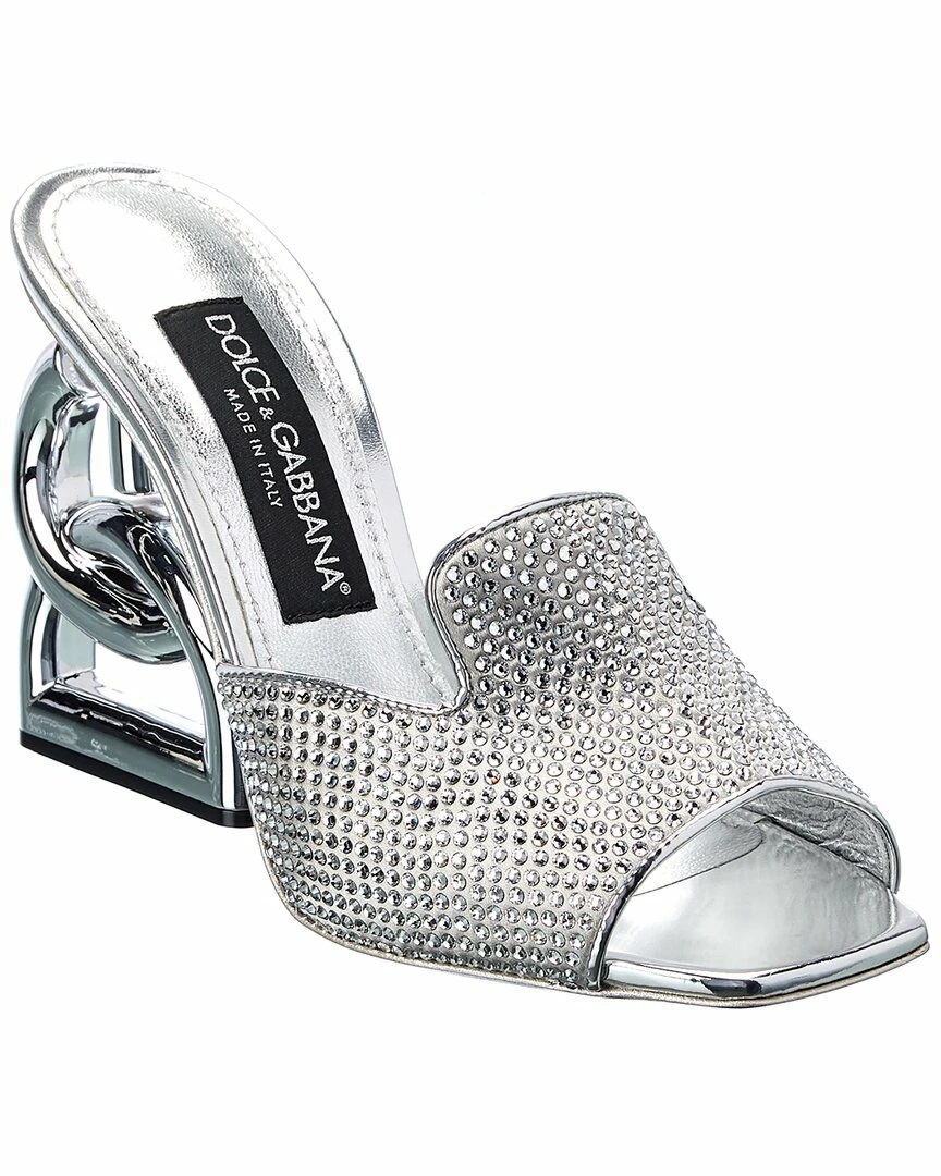 - DG 3.5 Satin & Leather Sandal in silver satin and leather and silver-tone hardware with rhinestone embellishments and logo heel