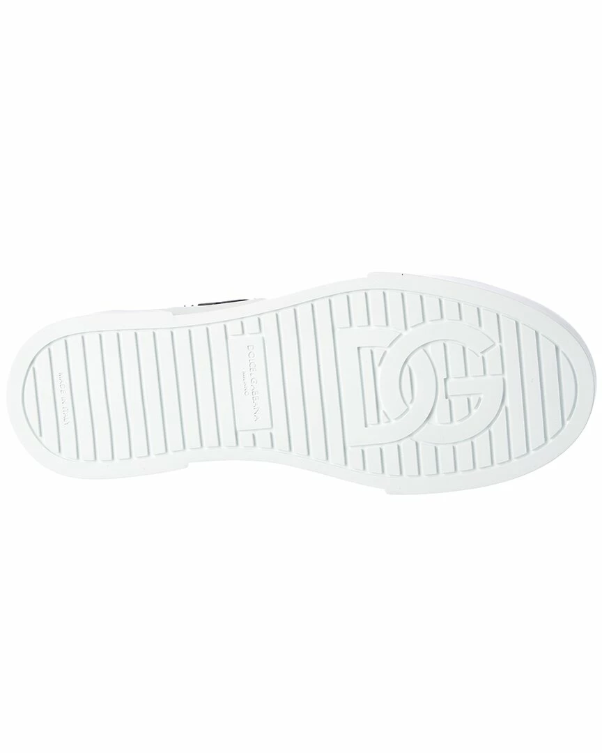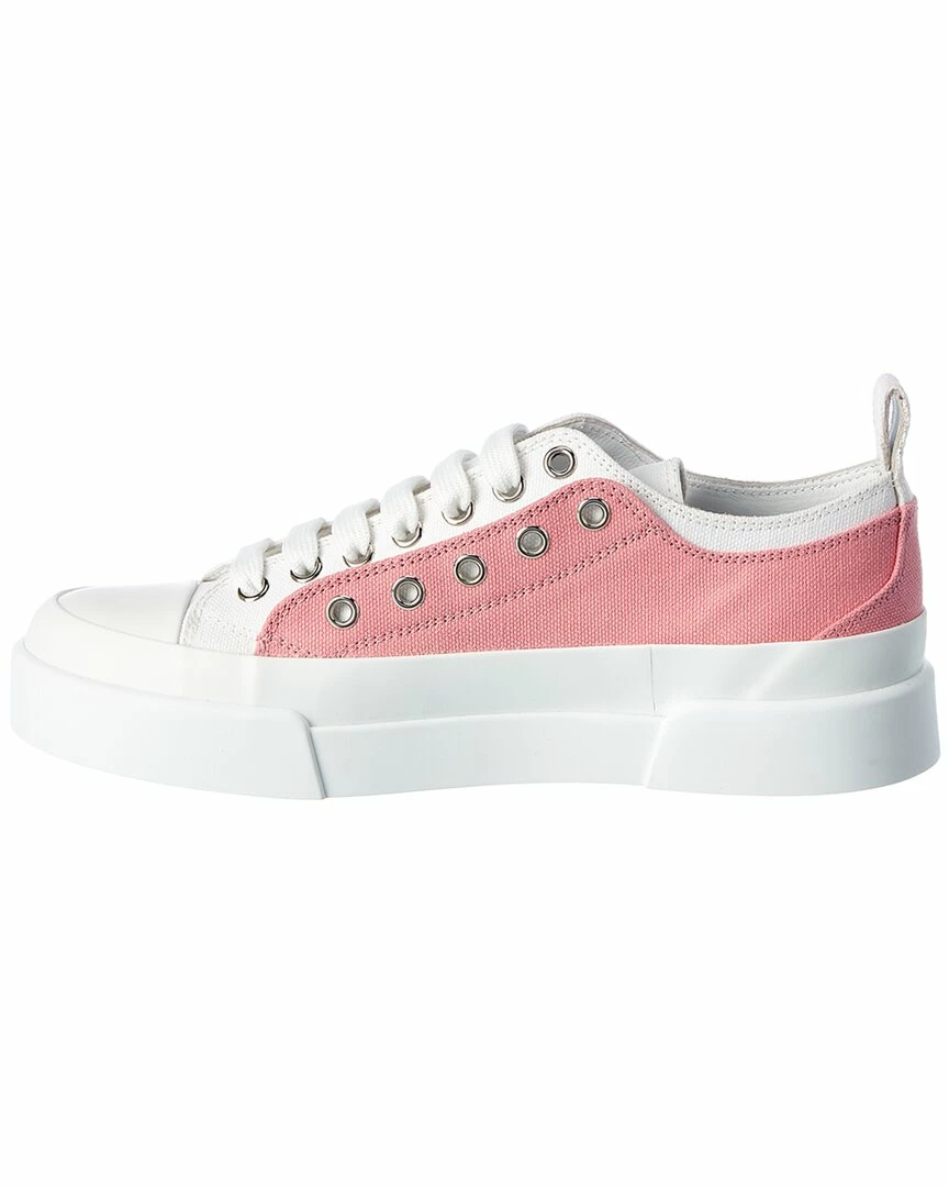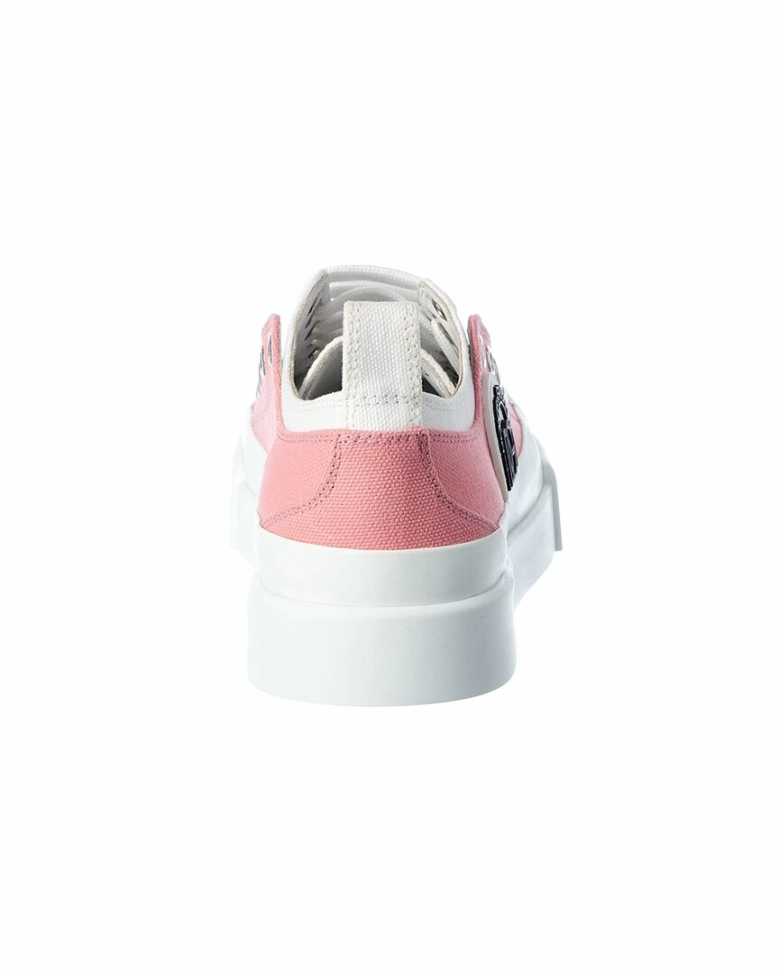 - DG Logo Portofino Light Canvas Sneaker in pink and white canvas and rubber and silver-tone hardware with patch logo