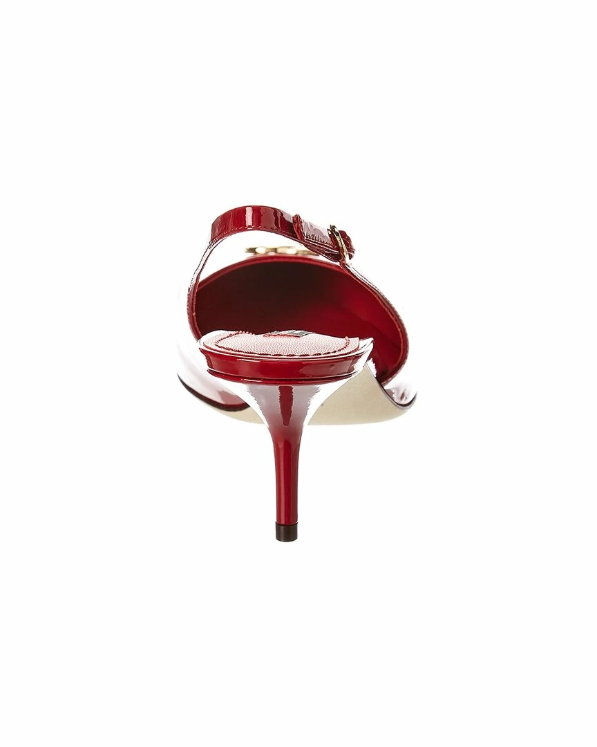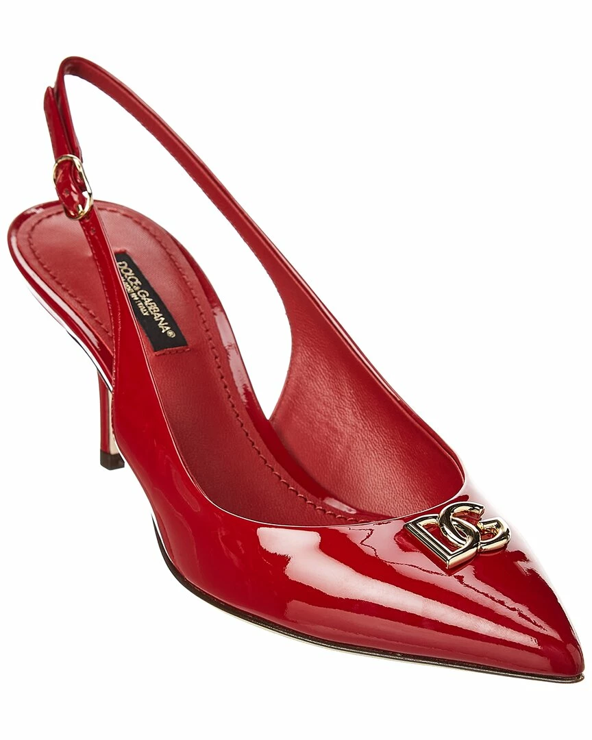- DG Patent Slingback Pump in red patent leather and gold-tone hardware with logo accent and pointy-toe