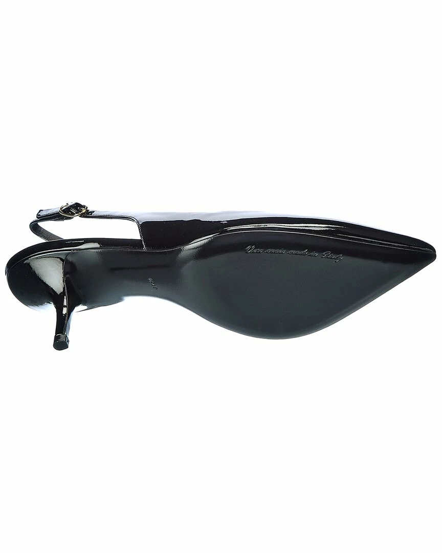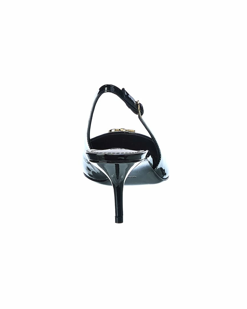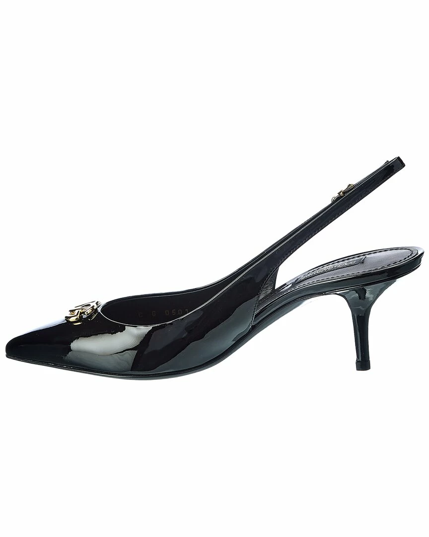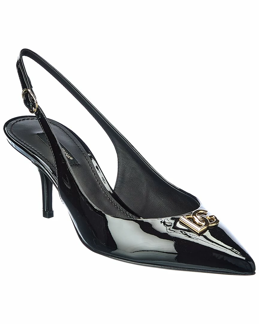 - DG Patent Slingback Pump in black patent leather and gold-tone hardware with logo accent and pointy-toe