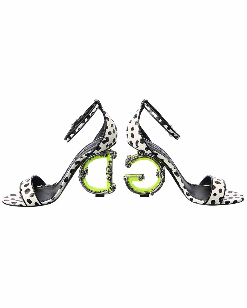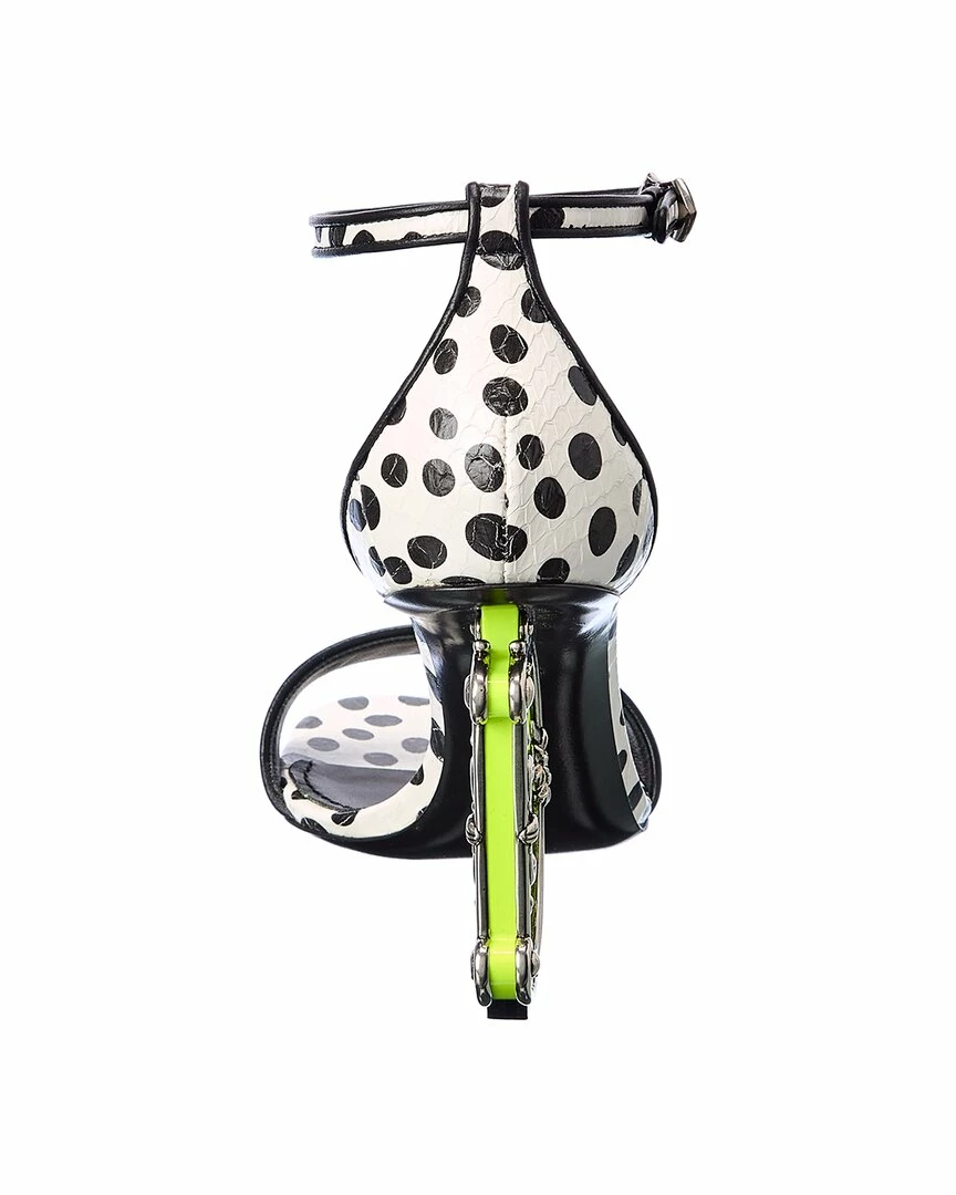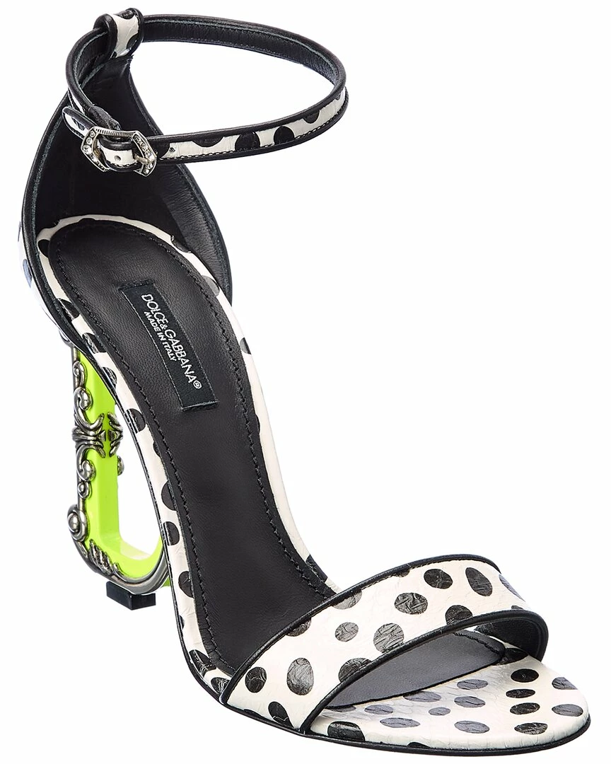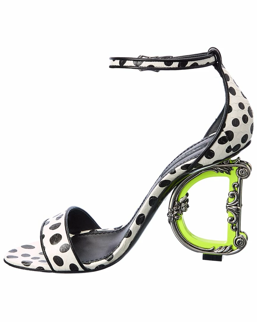 - DG Snakeskin & Leather Sandal in white printed Elaphe snakeskin and leather with silver-tone hardware and neon logo heel