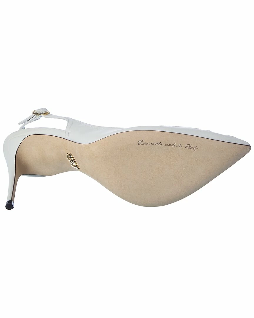 - Embroidered Leather Slingback Pump in white leather and gold-tone hardware with embroidered detailing and pointy-toe