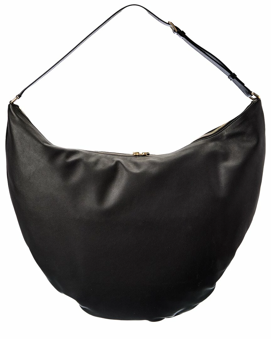 - Half-Moon Leather Hobo Bag in black leather and gold-tone hardware with embossed logo