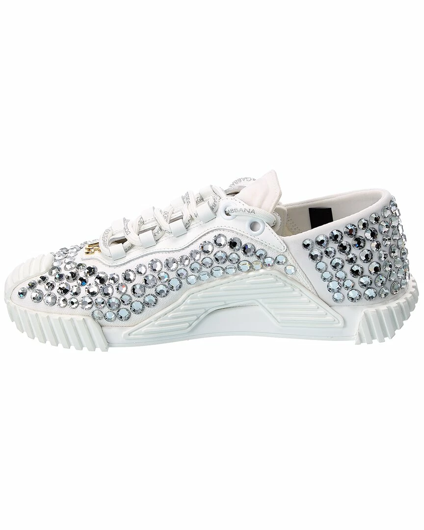 - NS1 Canvas & Leather Sneaker in white canvas and leather and gold-tone hardware with crystal embellishments and logo printed laces