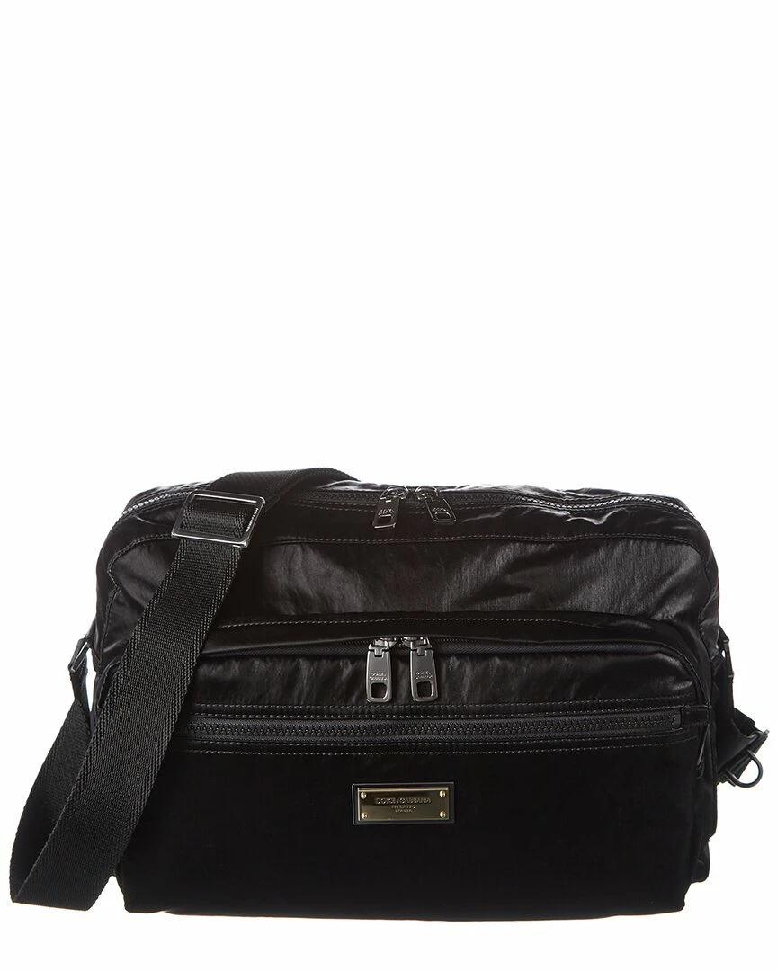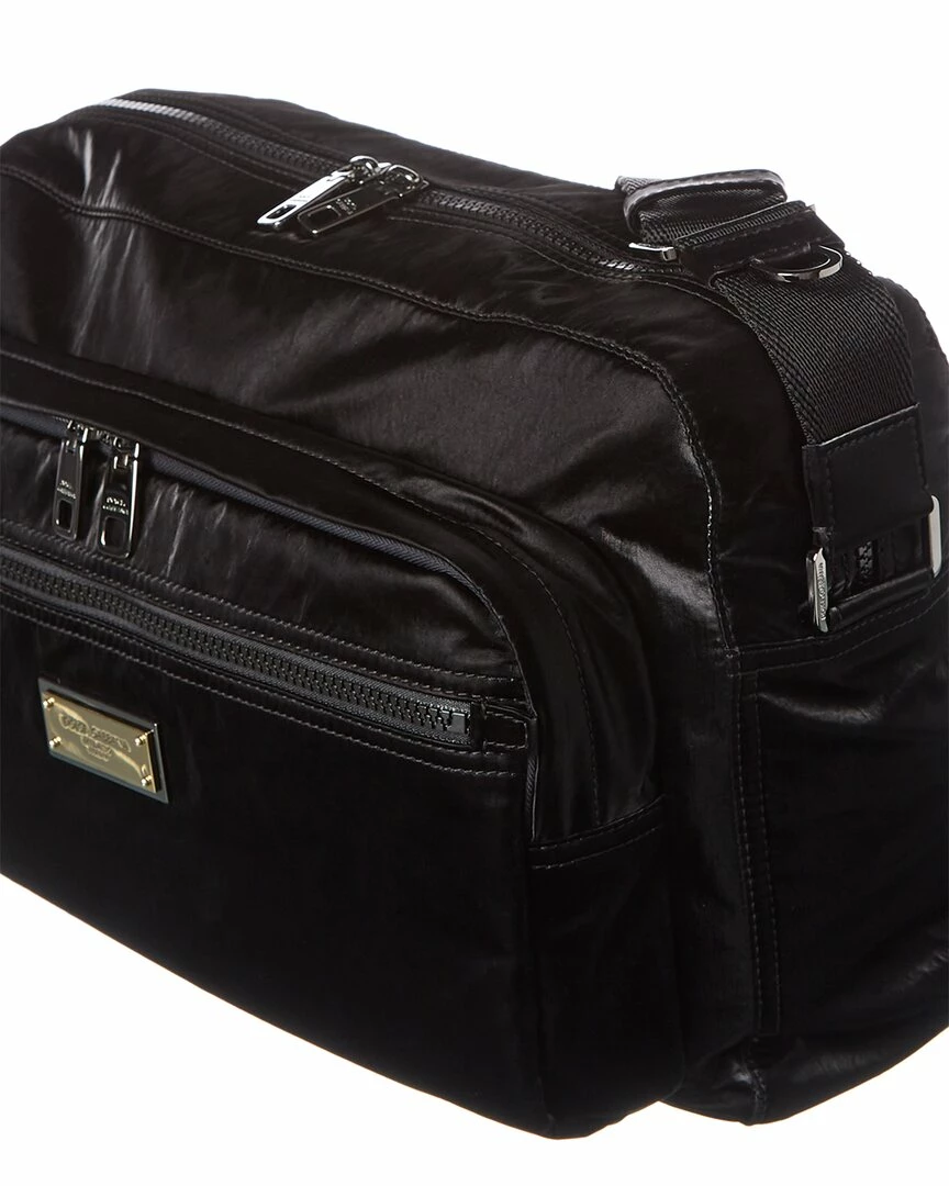 - Nylon Messenger Bag in black nylon with silver-tone and gold-tone hardware and zippered pockets