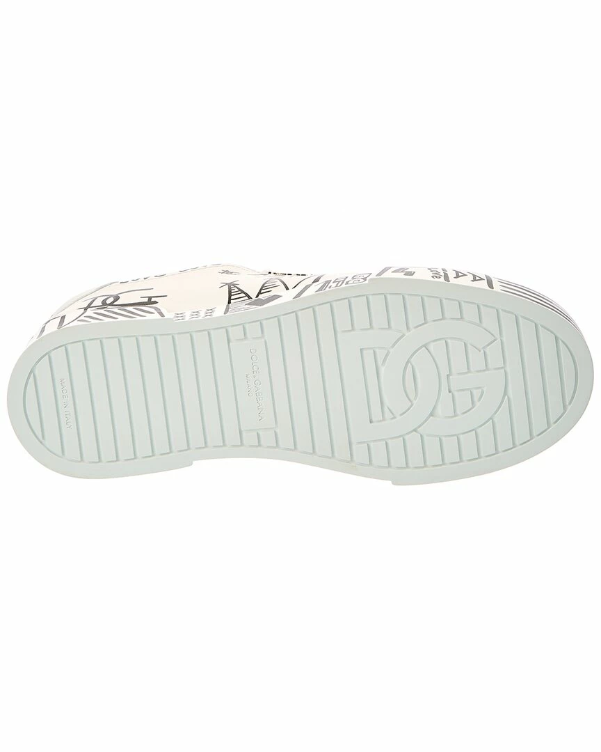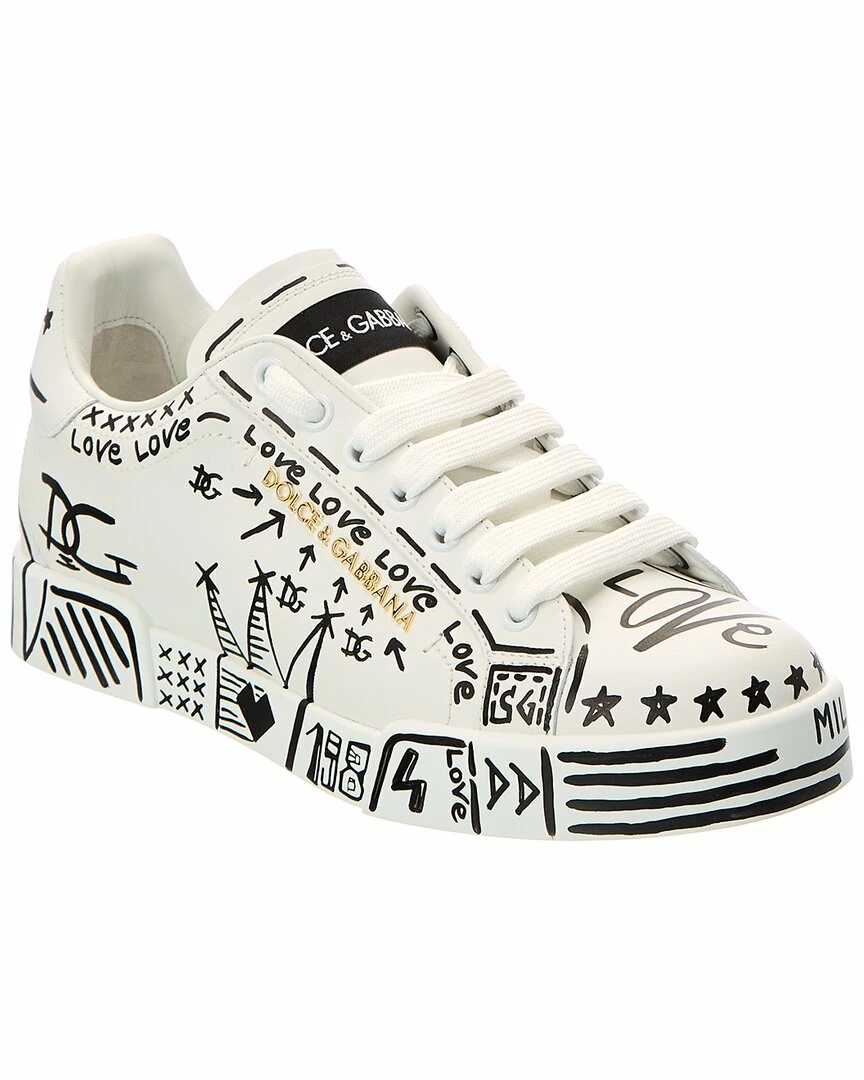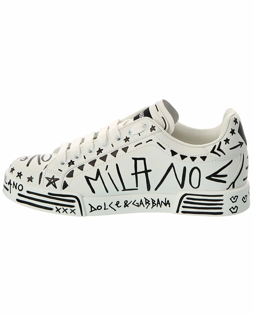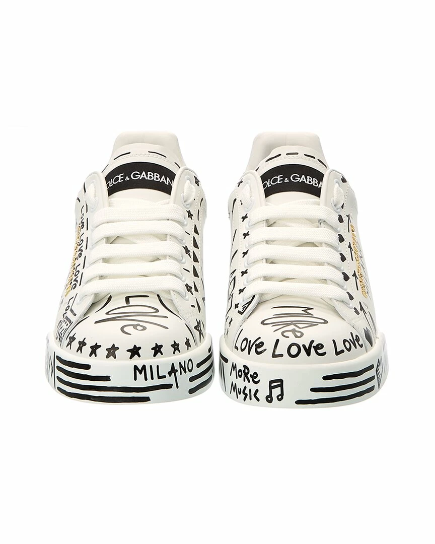 - Portofino Leather Sneaker in white and black leather and gold-tone hardware with drawn-on design