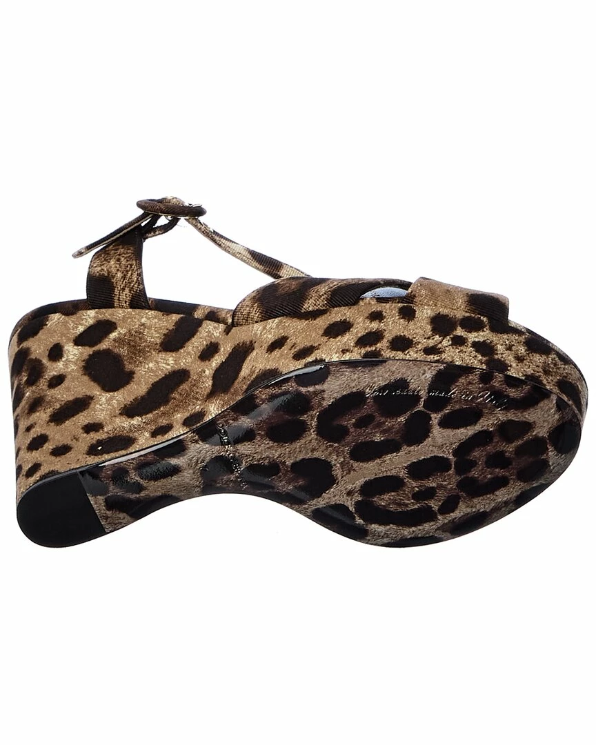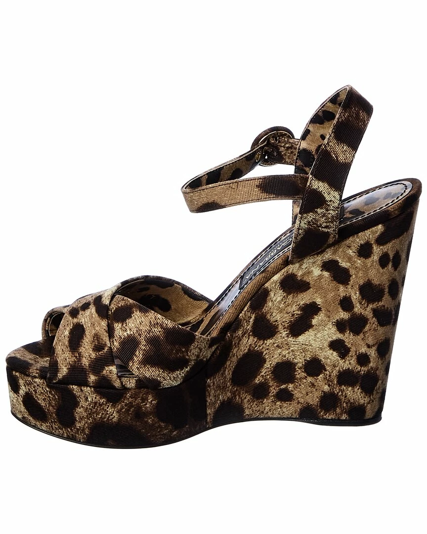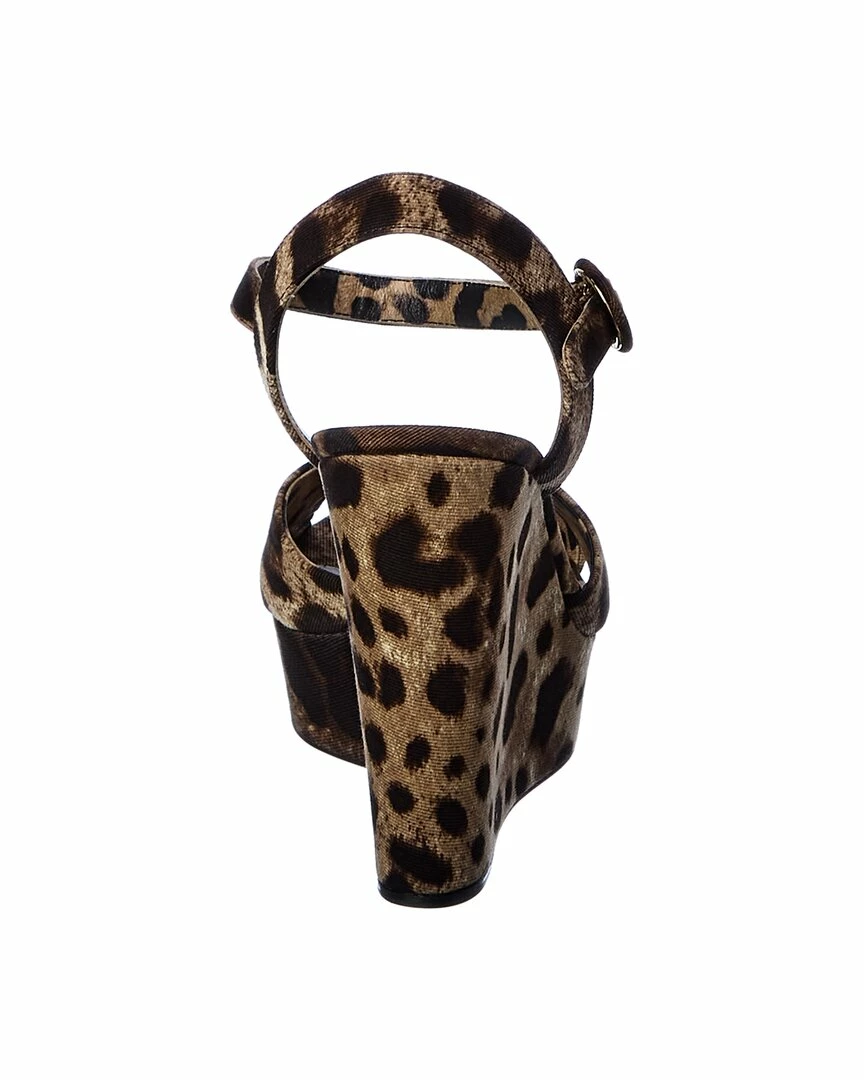- Printed Canvas Wedge Sandal in leopard print canvas and gold-tone hardware with crossover straps