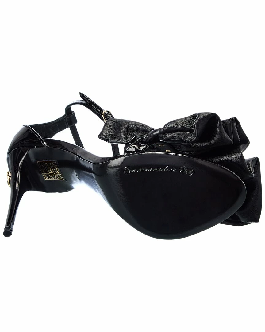 - Ruched Leather Sandal in black leather and gold-tone hardware with gathered accent and logo at heel