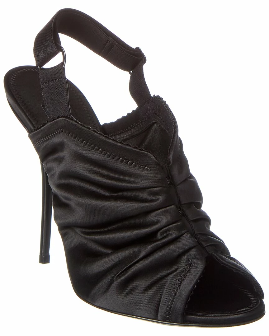 - Satin Slingback Sandal in black satin with hook-and-eye detailing and adjustable elasticized slingback strap