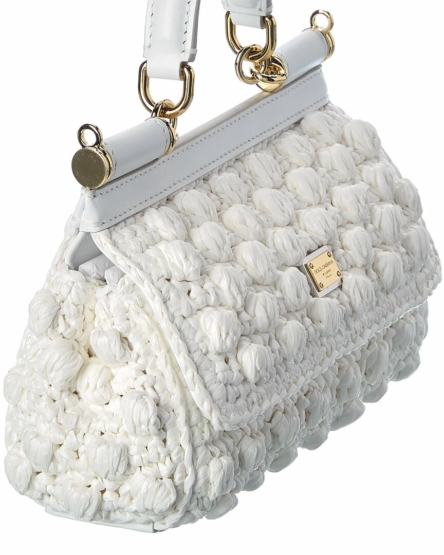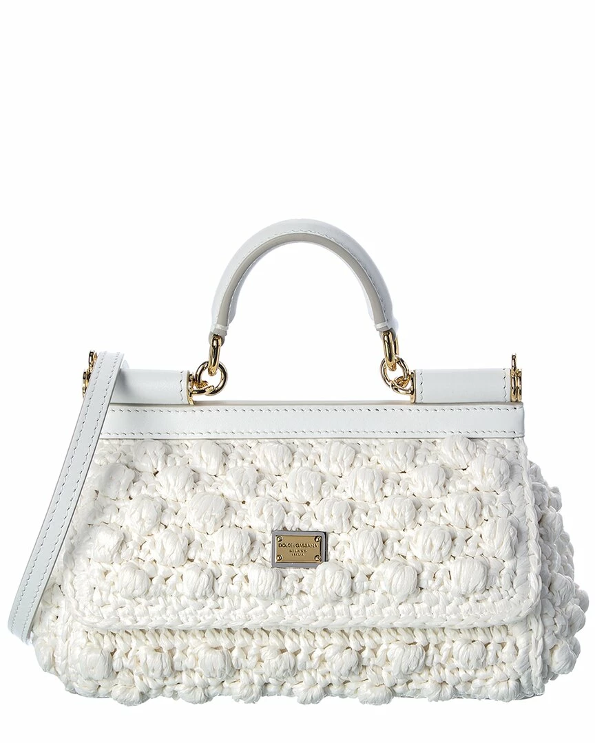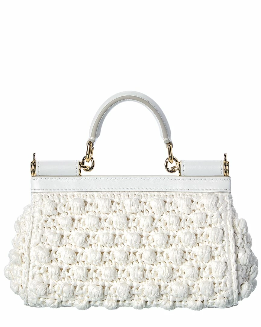 - Sicily Small Crochet & Leather Satchel in white crochet viscose raffia and leather with gold-tone hardware