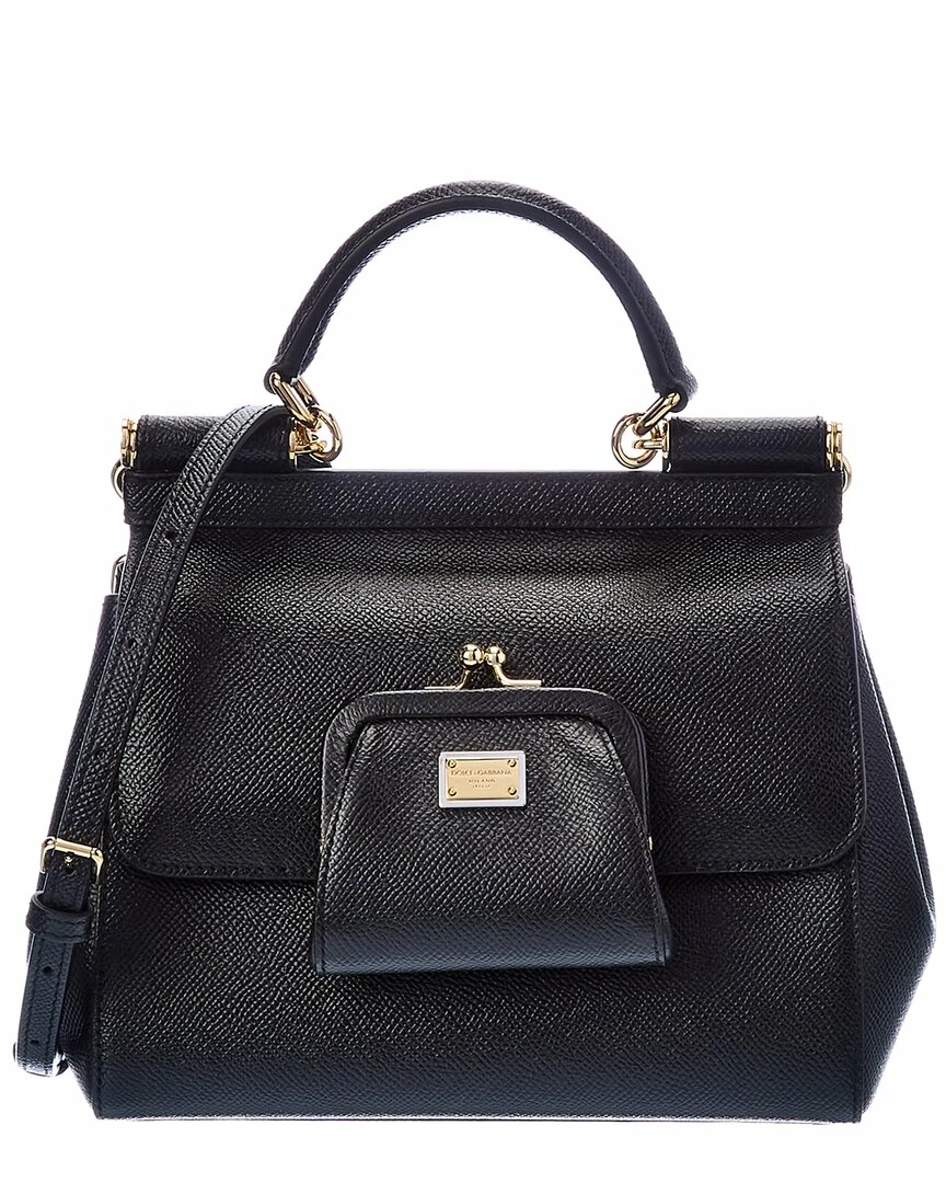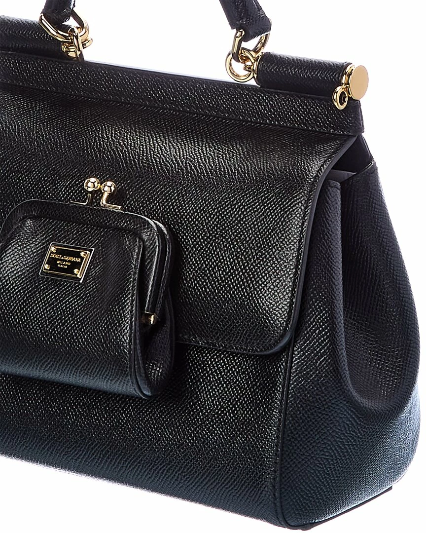 - Sicily Small Leather Satchel in black leather with gold-tone hardware and exterior mini pouch